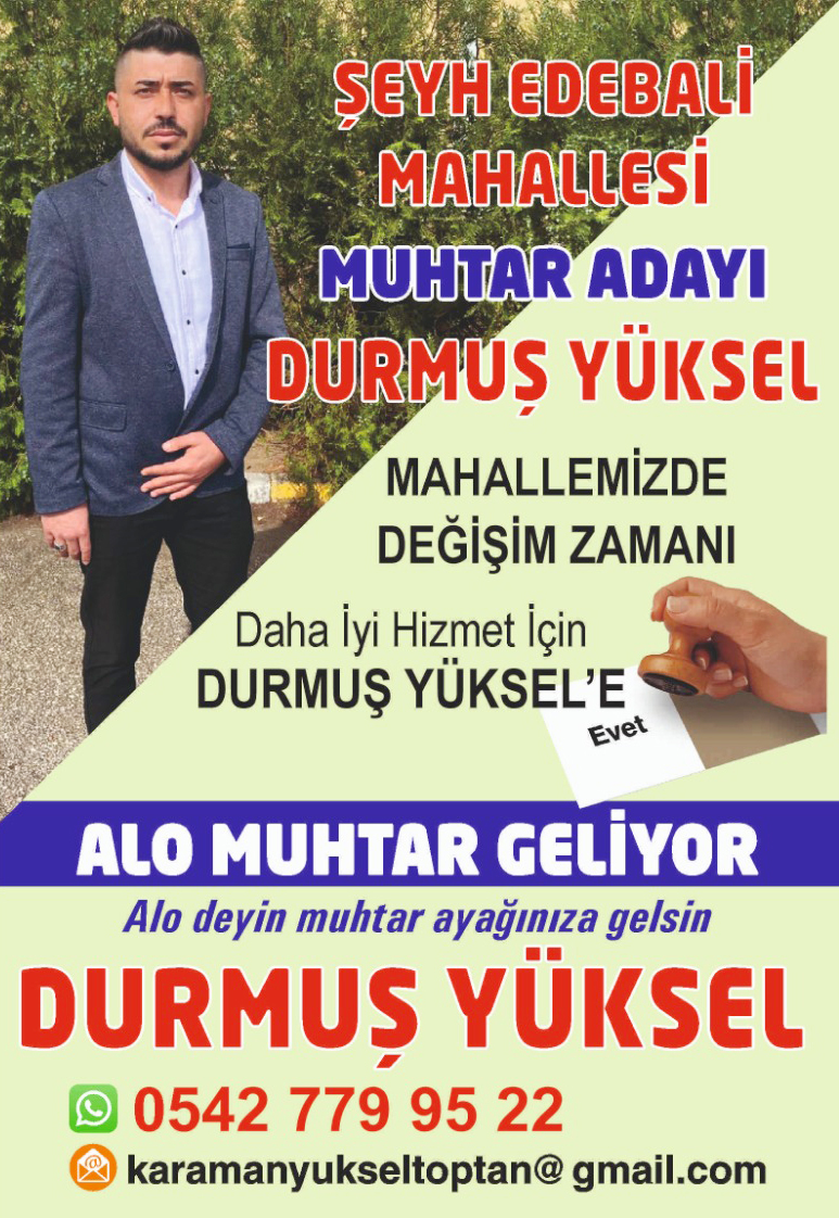 Ben Durmuş Yüksel. 20.10.1990 tarihinde Karaman’da doğdum. Mareşal Mustafa Kemal İlkokulunda öğrenimimi tamamladıktan sonra Fatih Lisesinde eğitim aldım. Konya Selçuk Üniversitesi Sosyal Bilimler Meslek Yüksekokulunda Pazarlama Bölümünü bitirdim. Babam Suat Yüksel Cerit köyünden olup annem Semiha Yüksel Karakışla köyündendir. Evliyim ve 2 çocuk sahibiyim. Eşim Sümeyye Yüksel Aybastı (Kemran) köyündendir. Evlendikten sonrada çocukluğumun geçtiği mahallem olan Şeyh Edebali Mahallesinde hala ikamet etmeye devam ediyorum. 2010 yılında üniversiteyi bitirdikten sonra Karaman’da ticaret hayatıma başladım. Yüksel Toptan Gıda Pazarlama’nın işletme sahibiyim. Aynı zamanda hayvancılık ve tarım işleri ile de uğraşıyorum. Çocukluğumun ve gençliğimin tek adresi olarak yaşamımı sürdürdüğüm Şeyh Edebali Mahallesine hizmet etmek için muhtarlığa adayım. Laf olsun diye bir adaylık açıklamıyorum. İcraat ve hizmet için durmadan çalışacağıma söz veriyorum.