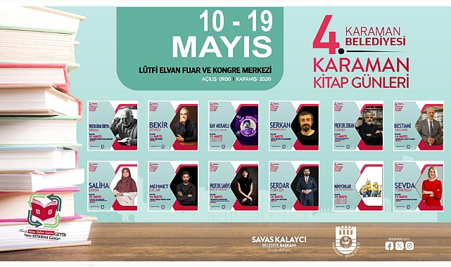 Bu yıl dördüncüsü gerçekleştirilen ve okurları çeşit çeşit kitaplarla buluşturan Karaman Kitap Günleri, yine birbirinden değerli şair ve yazarları ağırlıyor. Lütfi Elvan Fuar ve Kongre Merkezi’nde, 10 Mayıs Cuma günü açılışı yapılacak olan Kitap Günlerinde; tanınmış yayınevlerinin kitapları sergilenecek, her gün çeşitli gösteriler ve eğitici sunumların yanı sıra ünlü şair ve yazarların konferans ve imza günleri yer alacak. 10 gün sürecek Kitap Günlerine tüm Karaman halkı davet edilirken, etkinliğe katılacak yazar ve sanatçılar da şu isimlerden oluşacak: