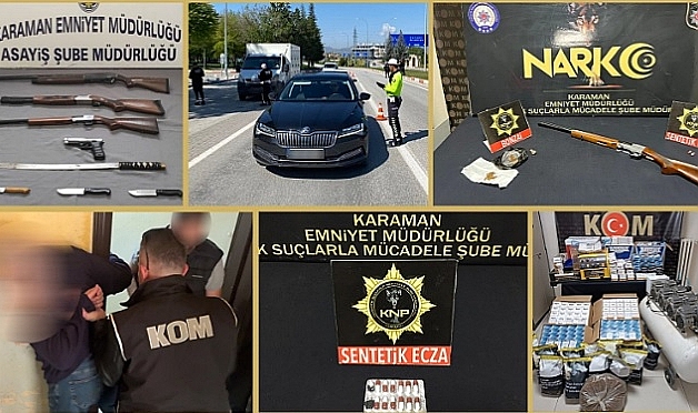 Yapılan çalışmalarda çeşitli suçlardan aranan 23 şahıs yakalandı. Bunlardan 10’u tutuklanarak cezaevine gönderildi. Karaman’da 11-17 Mayıs tarihleri arasında asayiş, narkotik ve trafik olayları başta olmak üzere vatandaşın huzurunu bozacak her türlü suçun engellenmesi, suça karışan şahısların yakalanması amacıyla yapılan çalışmalarda 48 araç sürücüsüne ehliyetsiz ve yetersiz ehliyetle araç kullanmaktan, 11 araç sürücüsüne alkollü araç kullanmaktan, 12 araç sürücüsüne kamunun huzur ve düzenini bozacak şekilde araç kullanmaktan işlem yapıldı. 78 araç ise trafikten men edildi. 13 sürücü belgesine de el konuldu.
