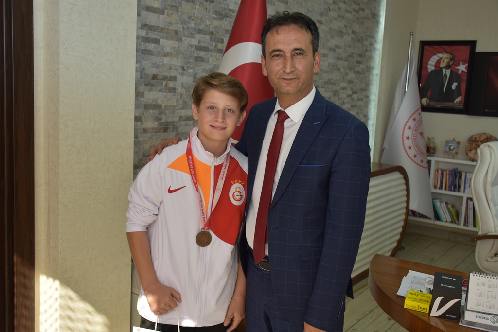 Karaman’ın sportif alandaki başarıları devam ediyor. Edirne'de düzenlenen Okul Sporları Yıldızlar Grekoromen Türkiye Şampiyonası’nda gösterdiği üstün performansla bronz madalya kazanarak Türkiye üçüncülüğüne ulaşan Yavuz Sultan Selim Ortaokulu öğrencisi İbrahim Mert Akdemir, İl Millî Eğitim Müdürü Mehmet Çalışkan’ı ziyaret ederek elde ettiği başarının mutluluğunu paylaştı.