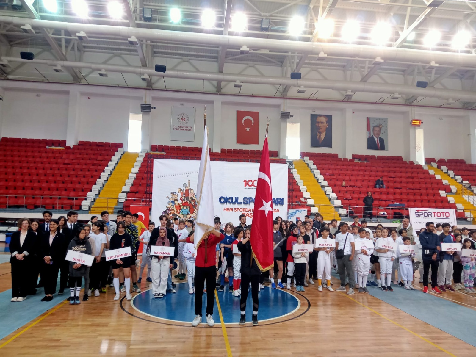 Okul sporları faaliyetleri kapsamında Karaman Gençlik ve Spor İl Müdürlüğü’nün ev sahipliğinde düzenlenen Okul Sporları Küçükler, Yıldızlar ve Gençler Eskrim Türkiye Birinciliği müsabakaları Merkez Spor Salonu’nda düzenlenen açılış töreni ile başladı. 4 gün sürecek müsabakalarda 45 ilden 748 sporcu epe, flöre ve kılıç kategorilerinde Türkiye’nin en iyisi olabilmek için mücadele edecek.