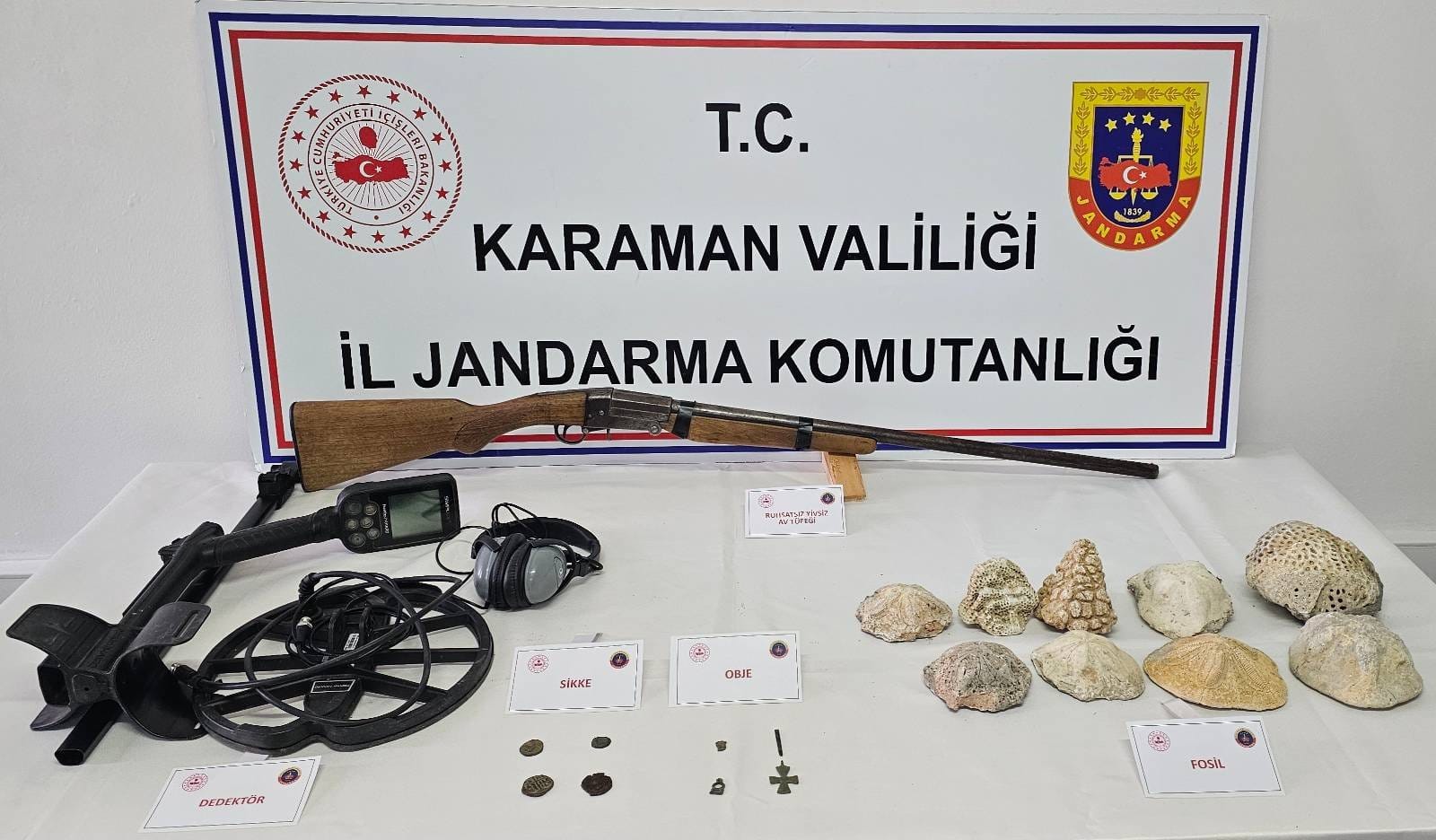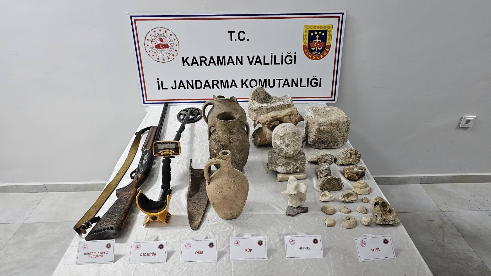 Denetimler sırasında ele geçirilenler ise dikkat çekiciydi: 25 karton kaçak sigara, 8000 adet bandrolsüz boş makaron, 4.800 gram nargile tütünü, 19 adet elektronik sigara, 4 adet elektronik sigara likiti, 120 litre el yapımı şarap, 13 litre el yapımı rakı, Roma dönemine ait tarihi eserler (hançer, küp, sikkeler, objeler, heykel figürü, figür işlemeli taşlar, oyma taşlar, metal obje, yazıt/anıt, sütun gövdesi, sütun ayağı), 86 adet fosil, 2 adet define arama dedektörü, 2 adet ruhsatsız av tüfeği ve 1 adet bıçak.
