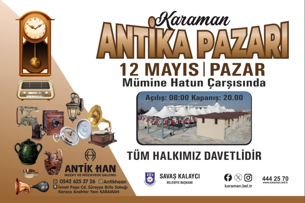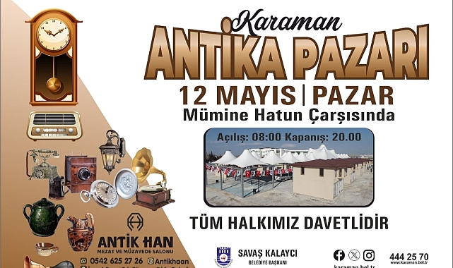 Karaman'da Antika Pazarı 12 Mayıs Pazar günü açılıyor. Karaman Belediyesi ve Antik Han Mezat ve Müzayede Salonunun destekleriyle düzenlecek olan pazar 08.00-20.00 saatleri arasında Karaman Adliyesi arkası Mümine Hatun Çarşısında açılacak.