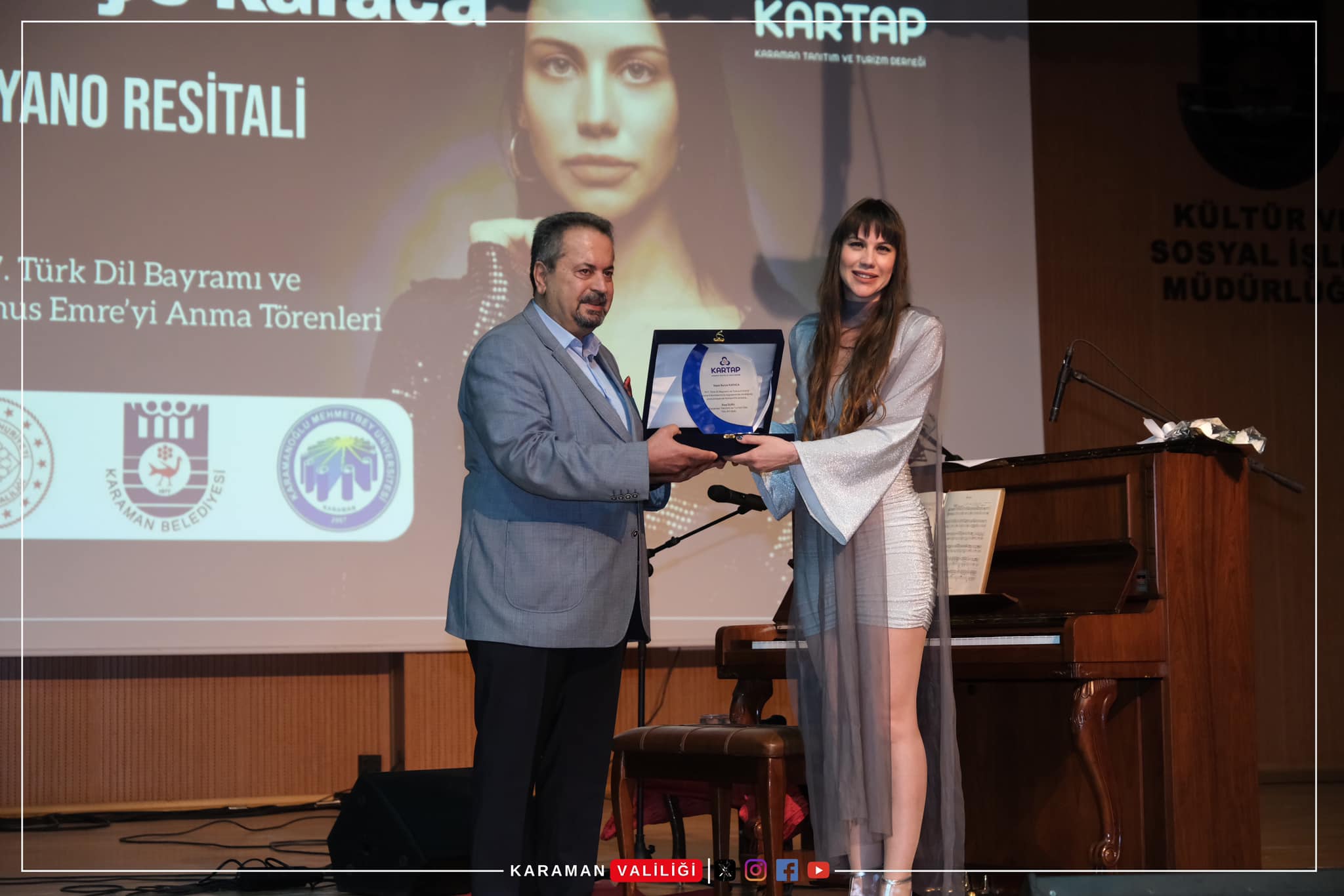 Karaman Valisi H. Engin Sarıibrahim ve eşi Hatice Sarıibrahim Hanımefendi, 747. Türk Dil Bayramı ve Yunus Emre’yi Anma Programları kapsamında Karaman Tanıtım Platformu’nun (KARTAP) katkıları ile gerçekleştirilen Piyanist ve Besteci Burçe Karaca’nın piyano dinletisine katıldı.
