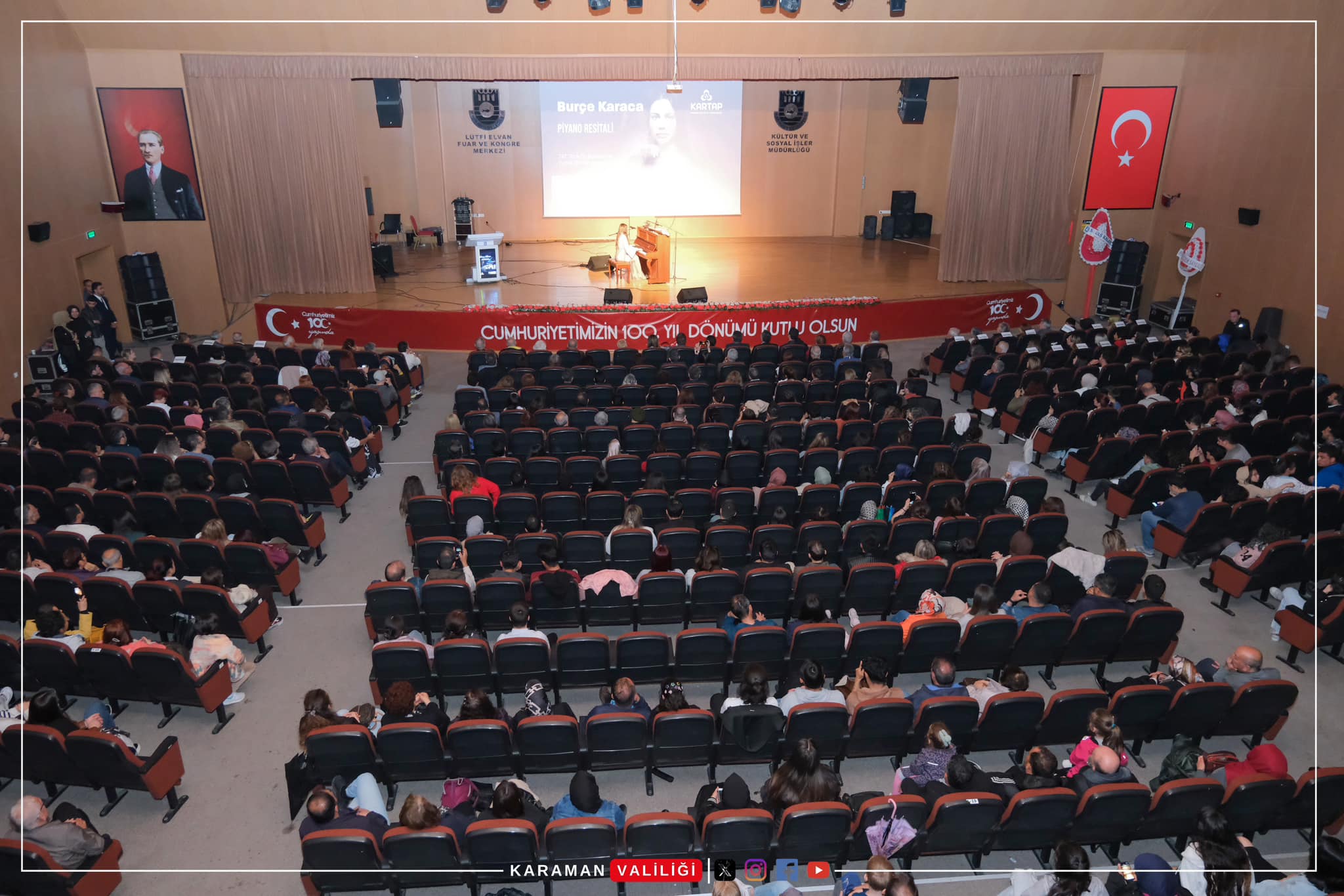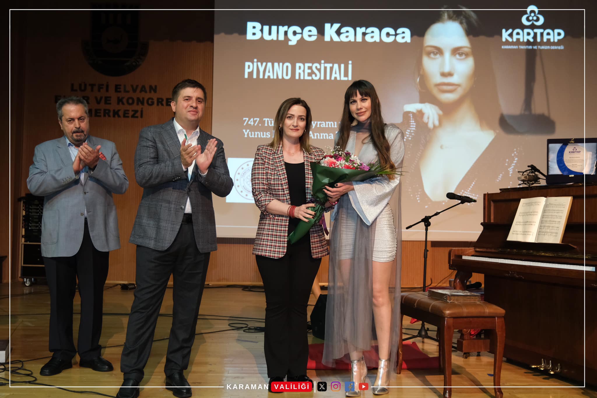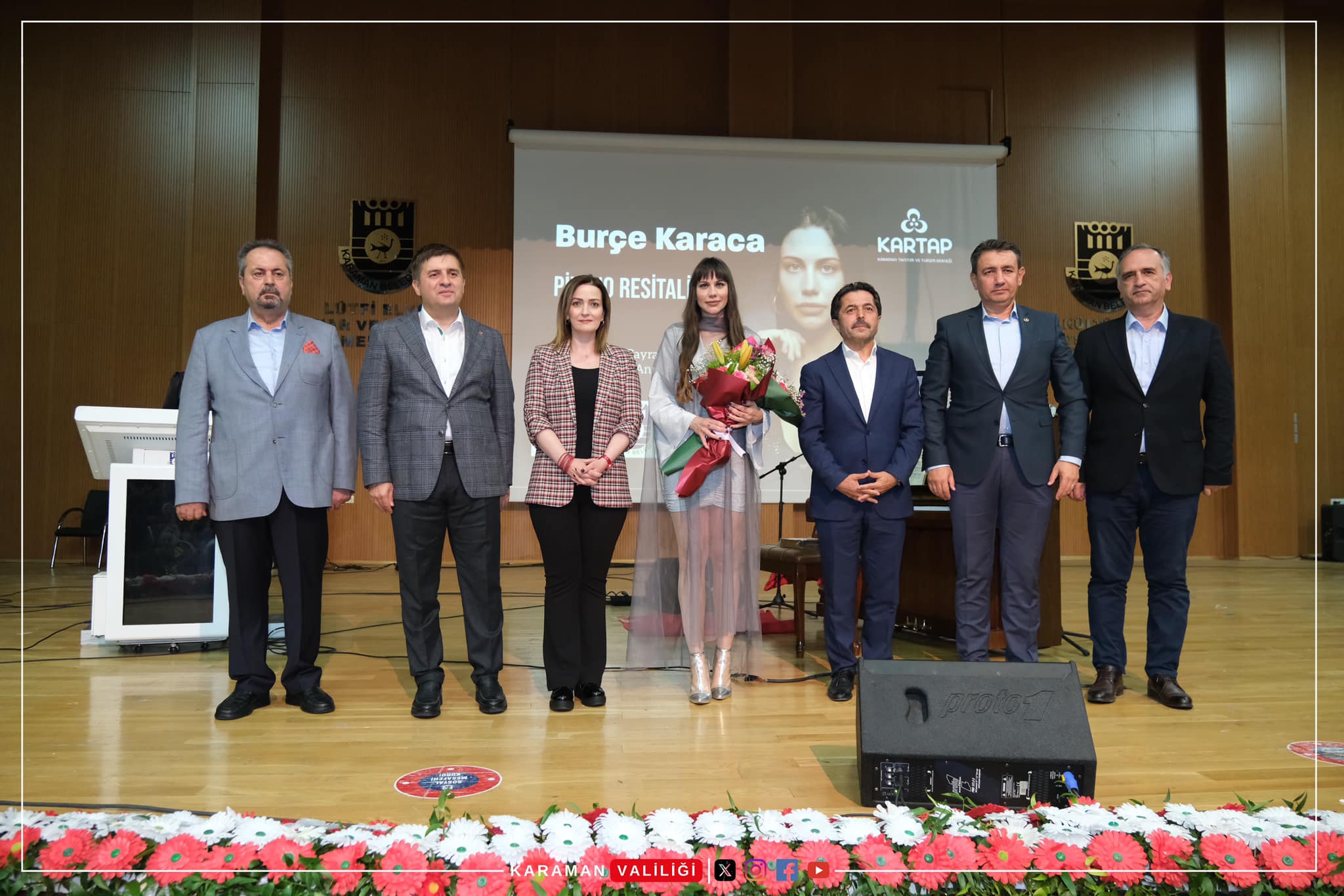 Karaman Milletvekilleri Osman Sağlam ve Av. İsmail Atakan Ünver ile Karaman Belediye Başkan Yardımcısı Eyüp Hüsamettin Aslan, KARTAP başkanı Rıza Duru, kurum amirleri ve vatandaşların da katıldığı konser sonrasında Vali H. Engin Sarıibrahim ve eşi Hatice Sarıibrahim Hanımefendi tarafından Piyanist ve Besteci Burçe Karaca’ya çiçek takdim edildi.