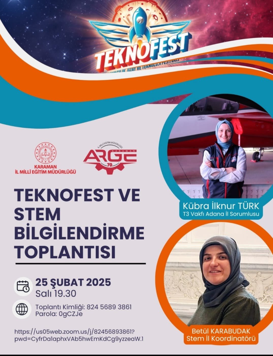 Karaman İl Milli Eğitim Müdürlüğü ve T.C. Gençlik ve Spor Bakanlığı ARGE Birimi iş birliğiyle düzenlenen TEKNOFEST ve STEM Bilgilendirme Toplantısı, dün (25 Şubat Salı günü) Zoom üzerinden çevrim içi olarak gerçekleştirildi.