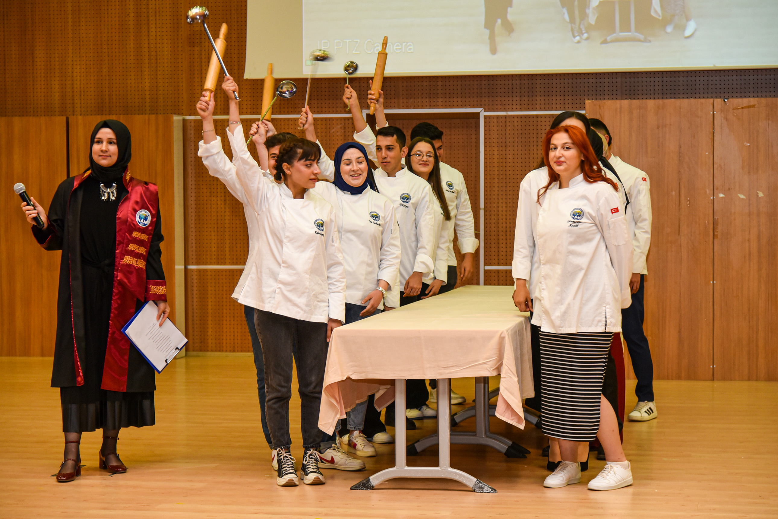 Yüksekokul birincisi Burhan Uysal’ın mezuniyet kütüğüne ismini çakmasının ardından dereceye giren öğrencilere ödülleri takdim edildi. Öğrencilerin kepçe devir teslim töreni ve aşçılık yemini etmesinin ardından Yüksekokul ve bölüm tanıtım videoları katılımcılarla buluştu. Mezuniyet belgelerini alan öğrenciler keplerini havaya atarak sevinçlerini doyasıya yaşadı.
