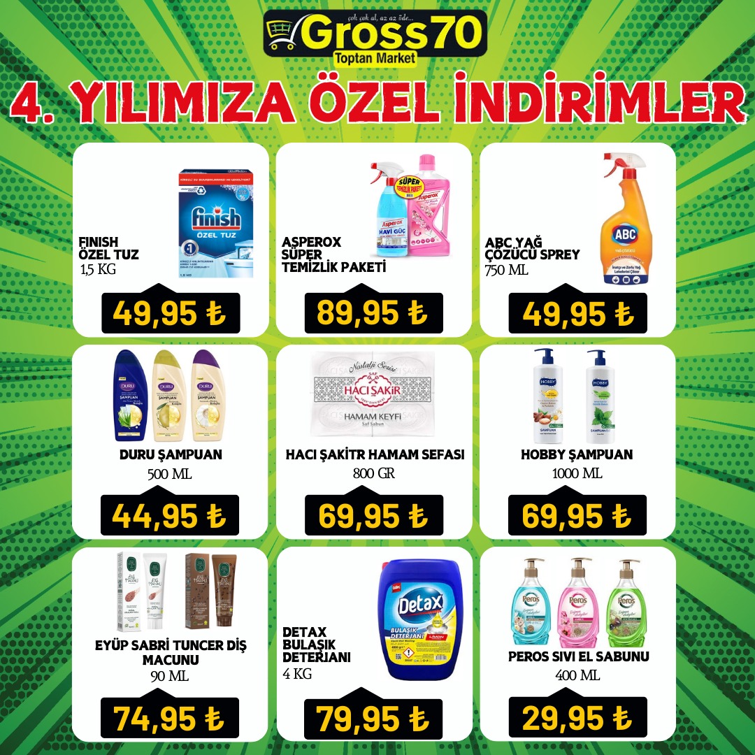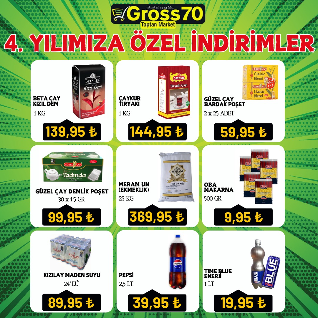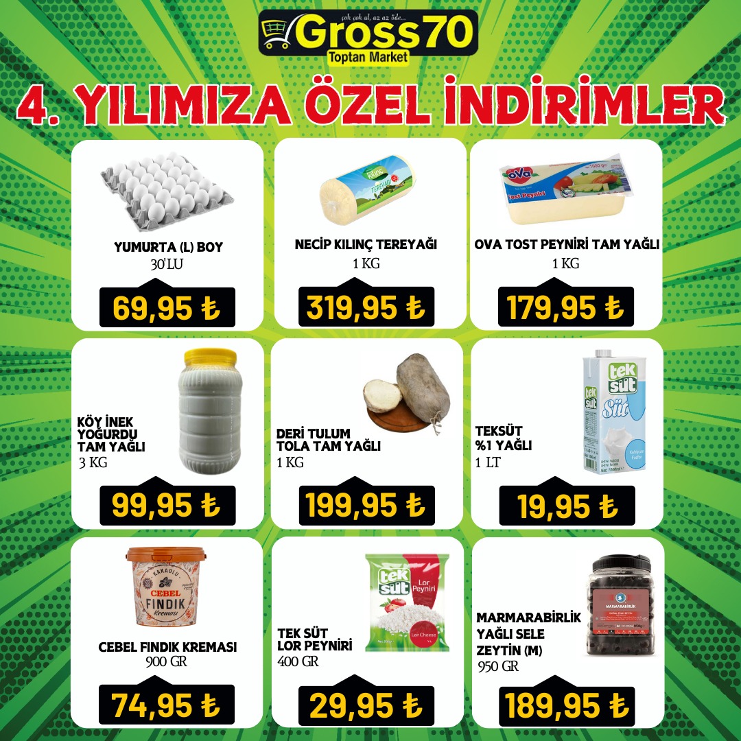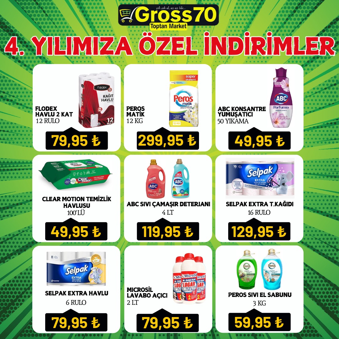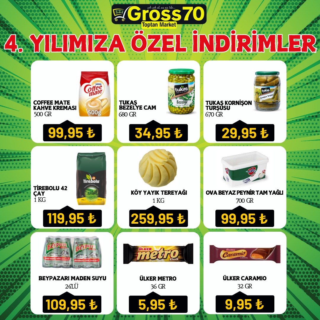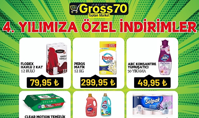 Karaman Gross70 Toptan Markette 4. yıla özel indirim şöleni başlıyor. Gross70 Toptan Market 4 yıldır Karaman'a kaliteyi ucuza sunmanın gururunu ve mutluluğunu yaşıyor. 4. yılın coşkusunu müşterileri ile paylaşmak için Gross70 Toptan Marketin hazırladığı eşsiz indirimleri kaçırmayın. İndirimli fiyatlarla alışveriş yapmak isteyenler 3 Haziran 2024 tarihine kadar Karaman Gross70 Toptan Marketi ziyaret edebilirler.