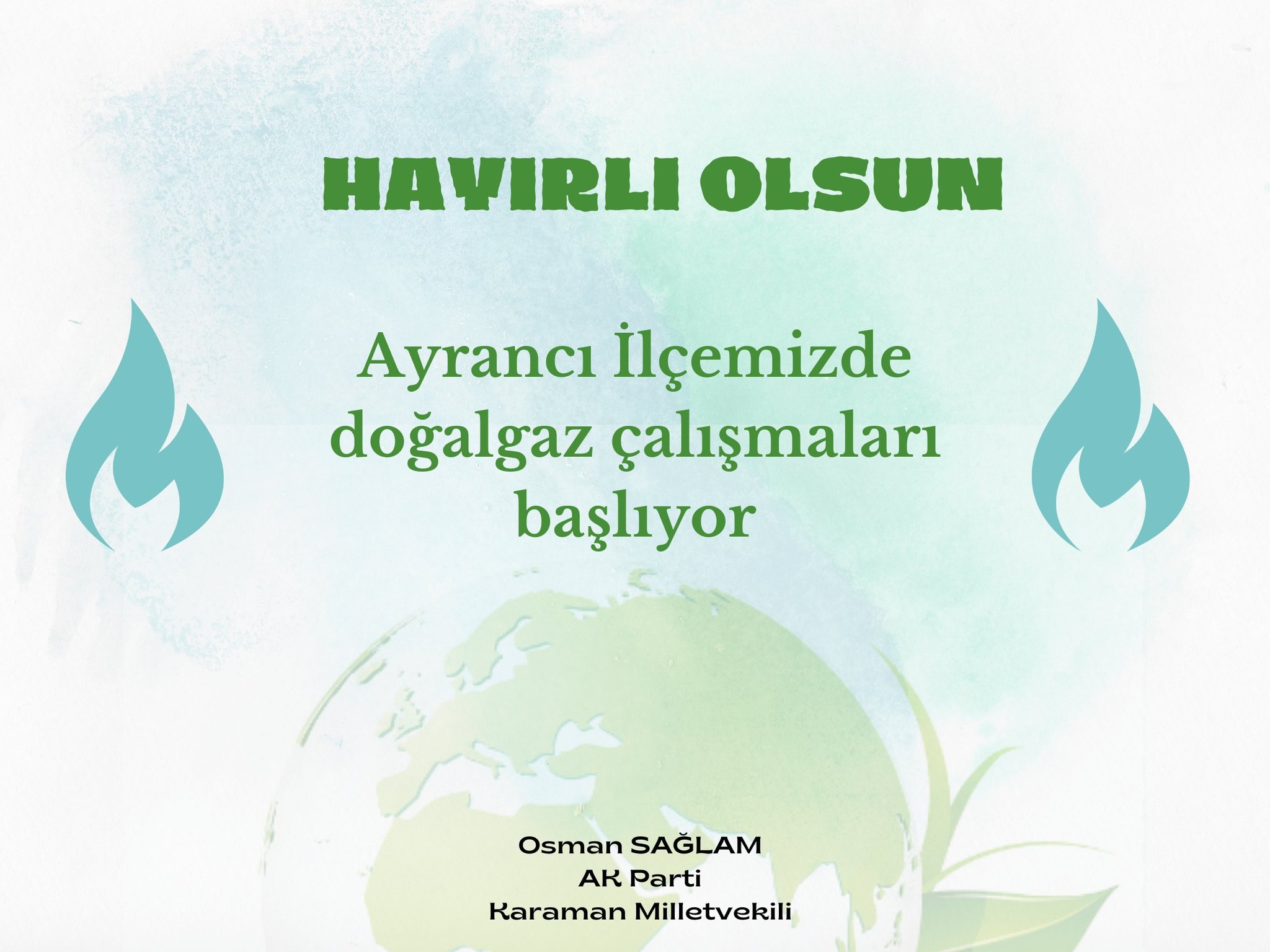 AK Parti Karaman Milletvekili Osman Sağlam, Ayrancı ilçesinde doğalgaz alt yapı çalışmalarının başlayacağı müjdesini verdi. Vekil Sağlam yaptığı açıklamada, "Ayrancı ilçemiz için tarihi bir gün. Bugün doğalgaz altyapı çalışmaları başlıyor. İlçemiz daha temiz ve verimli enerjiye kavuşuyor. Cumhurbaşkanımız Sayın Recep Tayyip Erdoğan'a, Enerji ve Tabii Kaynaklar Bakanı Sayın Alparslan Bayraktar'a, EPDK yetkililerine ve emeği geçen çalışanlara teşekkür ediyoruz. Memleketimize hayırlı olsun" dedi.